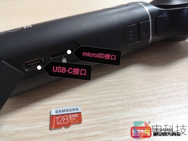 在靠近logo的区域,揭开设备自带的接口面板门,我们看到了设备的USB-C接口和microSD接口(卡槽),前者主要用于充电,后者则用于插入microSD卡保存拍摄数据。在开机状态下,如果设备缺少microSD卡,设备状态指示灯将闪烁橙色。