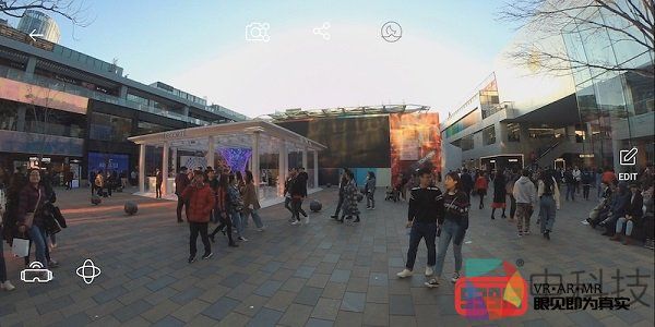 首先,我们在室外进行了360度全景和180度3D照片的拍摄。上图为360度全景照片的部分截图,从结果来看,作为近景的我们非常清晰,同时远景部分表现也不错。