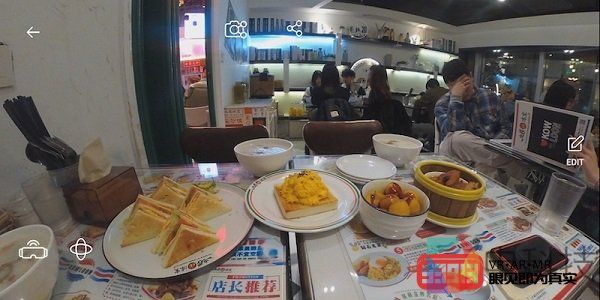然后,我们在室内(一家餐馆)进行了360度全景和180度3D照片的拍摄。上图为360度全景照片的部分截图,近景依然非常清晰,只是接缝处略有偏差。
