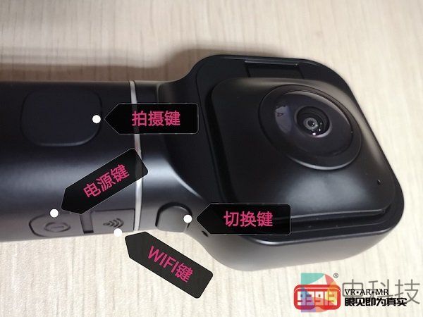 在摄像头的下方,有一个面积较大的圆角矩形按键,这是拍摄键,用于拍摄视频或照片。在拍摄键的右侧是电源键,用于开启和关闭设备。在电源键的上方是WIFI键,用于连接手机进行拍摄及管理。在WIFI键的上方有一个神奇的按键,这就是切换键,按下切换键,可以瞬间切换360模式和180模式(即全景拍摄和180 3D拍摄)。