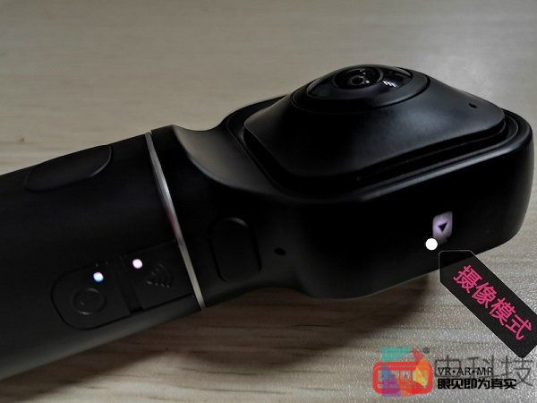下面我们重点来看摄像机本体。如果将带有“VUZE XR”logo的一面视为设备的正面,那么整台设备在正面及背面各分布了一个摄像头。摄像头的外延处有一个框体,这个框体可以将两个摄像头切换到一侧,只需按一个键,一部360度全景摄像机就变成了一部180度3D摄像机,是不是很酷?而且,切换为180模式的机身还有一种萌萌的科技感。