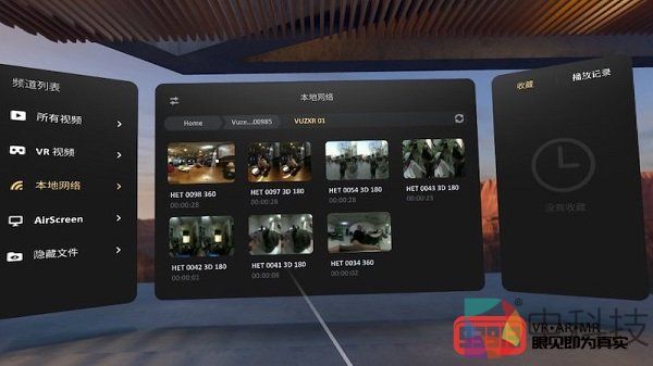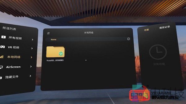 我们以小米VR一体机为例来介绍具体操作。Vuze XR在开机状态下,连按两次WIFI键,设备状态指示灯将闪烁蓝色。用小米VR一体机连接摄像机自身的Wi-Fi网络,之后使用系统自带的媒体播放器,即可在“本地网络”栏找到Vuze XR的视频文件目录并观看视频。