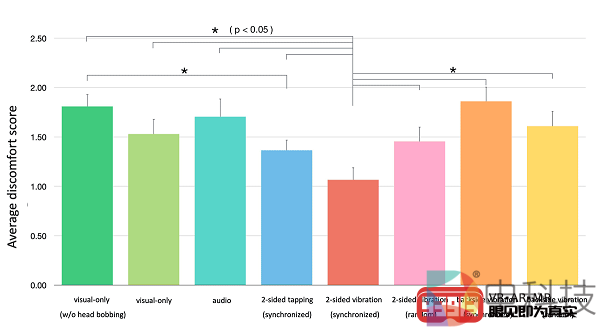 与没有触觉反馈的情况相比,所有双侧触觉设计均显著减少了VR晕动症。此外,采用双侧步态同步振动触觉提示的WalkingVibe系统与其他触觉条件(包括基于敲击的反馈)相比,明显减少了被测试实验人员的不适感,并显著提升了被测试实验人员的真实感。