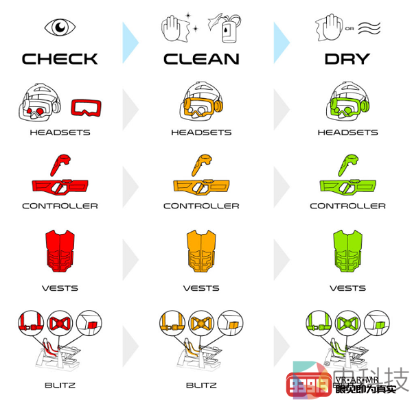 据悉,全新线下VR娱乐体验店卫生及安全标准内容涵盖了包括头显、耳机、手柄、触感背心在内的所有Hologate硬件。工作人员须依照该标准对硬件进行清洁工作。首先,工作人员须检查设备是否磨损,有磨损的设备要立即下架;其次,工作人员须用消毒湿巾对设备进行彻底的清洁。通过以上两大步骤后,工作人员方可将设备开放给用户体验。