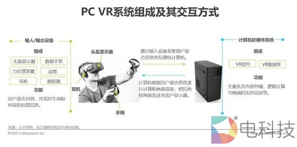 虚拟现实是一种可以创建和体验虚拟世界的计算机仿真系统,通过计算机生成的、可交互的三维环境为用户带来沉浸感。按照用户交互形式和沉浸感的程度不同,虚拟现实系统可以分为桌面式VR系统、分布式VR系统、增强型VR系统及沉浸式VR系统。桌面式VR是最早期的VR类型,主要利用计算机进行仿真并通过计算机屏幕显示虚拟环境、通过鼠标与虚拟环境进行交互,沉浸感弱。沉浸式VR是目前消费者最常见的VR类型,主要利用各类输入与输出设备为用户带来极致的沉浸体验。沉浸式VR包括基于头盔显示器的沉浸式VR与投影式VR,其中基于头盔显示器的沉浸式VR系统是目前发展的主流。按照设备类型分类,基于头盔显示器的沉浸式VR又可以分为基于PC的VR、基于手机的轻量级VR及VR一体机三大类型。PC VR沉浸感强,用户体验效果好,但是对PC高性能的要求导致用户成本高,有线连接导致用户自由度低。基于手机的轻量级VR与一体机VR性能低,支持的业务有限,但是成本低,无线连接自由度高。下面以PC VR为例,介绍沉浸式VR系统的组成及其交互方式。PC VR主要由输入/输出设备与计算机软硬件系统组成,其中输入/输出设备主要负责用户姿态的识别,并生成反馈信息,计算机主要负责内容存储、计算与画面的实时渲染等,两者通过有线进行信息交互。