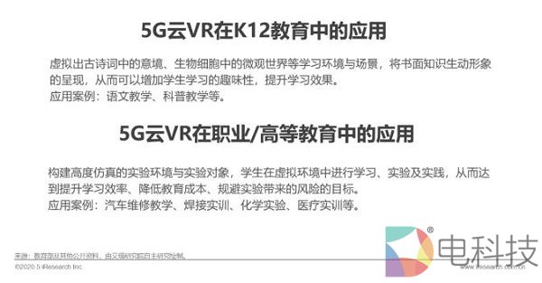 云VR在教育领域中的应用主要涉及K12教育和职业/高等教育两个细分领域,其中在K12教育中的应用主要是视频教学类的场景,属于弱交互VR,在职业/高等教育中的应用既包括视频教学类应用,又包括实操类的强交互VR应用。基于5G的云VR传输方案能保障视频教学类应用的良好体验,基于5GMEC的云VR解决方案才能为实操类应用提供更好的体验。目前,VR在教育中的应用,以建立专用VR教室的形式在各院校中推广。2018年,我国小初高学校共有22.8万所,按照40人的专用VR教室配置,预测该市场将达到912万的用户规模。2018年,我国职业及高等学校共有1.3万所,按照100人的VR实验室配置,预测该市场将达到130万的用户规模。在内容方面,K12教育的VR课件开发难度低,职业、高等教育实操类的VR应用,专业性强,开发难度较高。因此,在教育应用场景中,K12教育及职业、高等教育中视频直播教学等视频教学类应用场景的体验易保障,且内容开发难度低,发展速度快。
