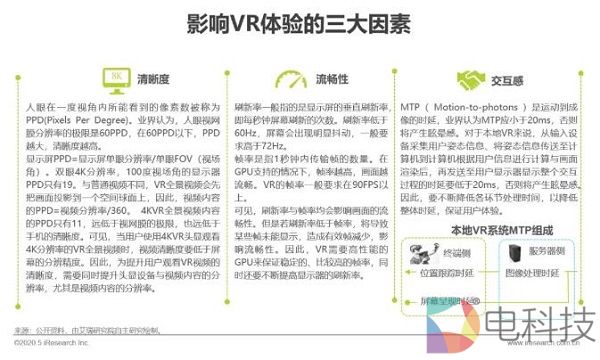 清晰度、流畅性及交互感是影响VR体验的三大因素。清晰度主要受视频内容与显示屏分辨率的影响,低分辨率的视频内容或显示屏将导致视频的清晰度低,容易使用户产生疲劳感,难以沉浸其中。流畅性主要受帧率与刷新率的影响,高帧率与高刷新率可以使画面更加流畅,用户体验更好。交互感主要受时延的影响。对于强交互业务来说,业界认为,MTP要控制在20ms以内,否则用户将产生眩晕感。