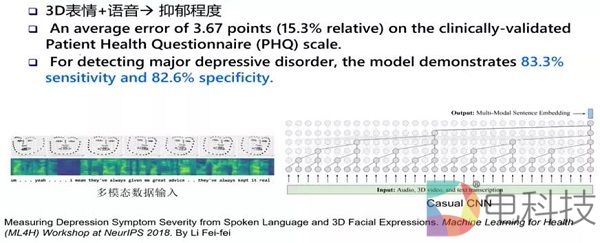 更进一步,斯坦福大学的李飞飞,2018在NeurIPS上也曾介绍了一项基于3D表情和语音的抑郁症评估,核心是用多模态的数据进行分析。模型由两个技术部分组成:(i)一个句子级的“概要”嵌入(嵌入的目的是“概括”一个可变长度的序列,将它变为固定大小的数字向量。)和(ii)一个因果卷积网络(C-CNN)。实验分为两部分。首先与现有测量抑郁症症状严重程度的工作进行了比较,预测PHQ评分,并输出关于患者是否患有重度抑郁症的二元分类,通常PHQ评分大于或等于10。对模型进行消融研究之后特异性和敏感度分别做到了82.6%和83.3%。