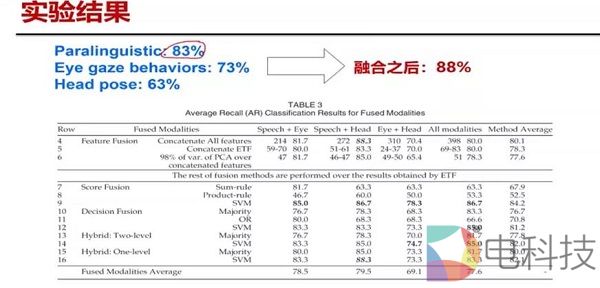此项测试实验结果表明,如果用副语言特征就会做到83%,用眼动行为能做到73%,用头部估计能做到63%,融合之后能够做到88%的精度。因为只有60个人的数据,且有30个是重度抑郁症,所以这个结果差强人意。
