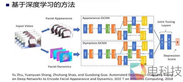 但人工定义特征更多的是传统的“专家模式”,2018年,采用深度学习的方法,《IEEE Transactions on Affective Computing》期刊中的一项工作将表征信息和动态信息分两路馈送到CNN网络里面,然后输出一个抑郁分数(Depression Score)。训练数据是AVEC2013的一个子集,包含82个人的150段视频。整个结果做到了7.58的MAE精度。