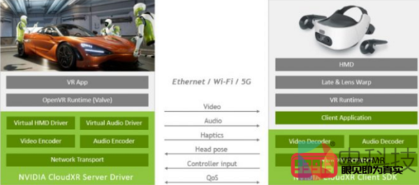 NVIDIA表示,网络运营商可以通过CloudXR将任何SteamVR内容流式传输给Windows或安卓系统用户,而无需对流应用进行任何特殊修改。这些内容可能是游戏和娱乐内容,也可能是企业和生产力内容,例如高端3D可视化或沉浸式设计应用,或是运营商想要向其客户提供的任何产品。