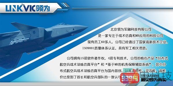 北京领为军融科技有限公司是一家专注于战术仿真和MR应用的科技公司,现有员工60多人,公司已经通过了国家高新技术企业、ISO9001质量体系认证,具有军工相关资质。