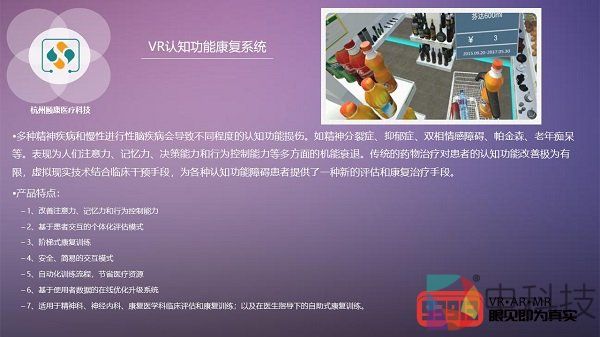 认知功能康复软件是结合临床干预技术,基于虚拟现实平台开发的临床应用解决方案。该产品主要应用于,各种脑功能疾病所致认知功能损害的康复训练,如退行性脑疾病、精神疾病及脑损伤所致的注意力、记忆力、执行控制能力障碍等。