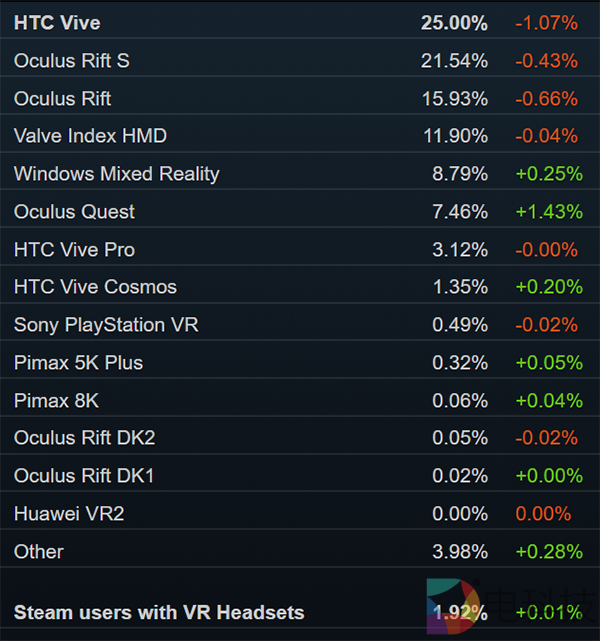 5月Steam硬件和软件调查报告显示,Valve Index以11.90%的份额居于Facebook(Oculus)和HTC Vive阵营之后,虽然整体份额上的差距依然很大,但从最近几个月的数据趋势来看,差距在一点点缩小。