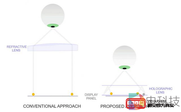 目前市面上流通的VR头显都采用了相同的光学管道,通过光学镜头将光线聚焦到显示屏从而使用户可以看到具体成像。但是为了实现这一点,通常光学镜头与显示屏之间都保留了几英寸的设计距离,因为如果不这样设计,光学镜头就无法让光线聚焦从而使用户看到显示成像。