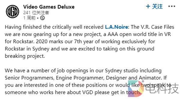 ▲「荒野大镖客2 VR」真要来了? 根据Video Games Deluxe工作室的领英页面消息,R星(Rockstar Games)正在开发一款3A级开放世界VR游戏。Video Games Deluxe工作室将