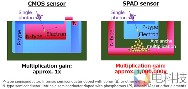 SPAD传感器是一种特殊配置的传感器,在其每个像素内放置了一个二极管。每一个二极管在接收到一个入射的光子时,都能将这个光子转变成载流子的“雪崩效应”,从而产生一个大的电脉冲信号。这种从单光子产生雪崩倍增效应的能力,在图像捕捉时可以提供更高的灵敏度,和更高的距离测量精度。