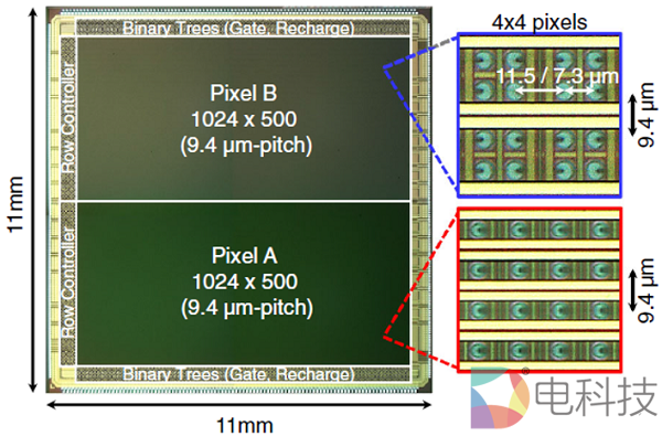佳能100万像素时间门控SPAD图像传感器架构,芯片显微图和像素阵列放大视图