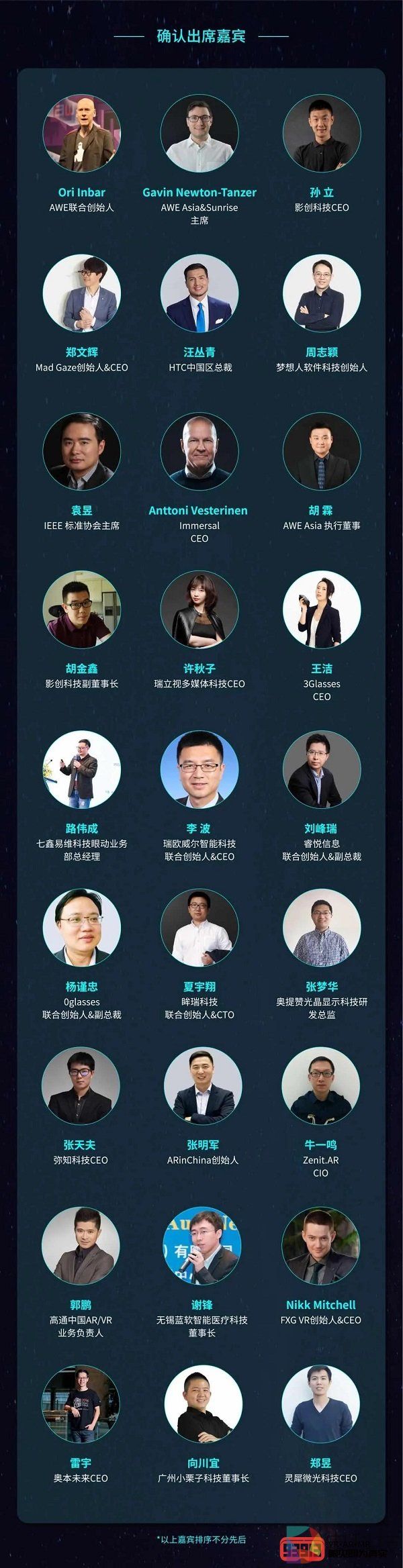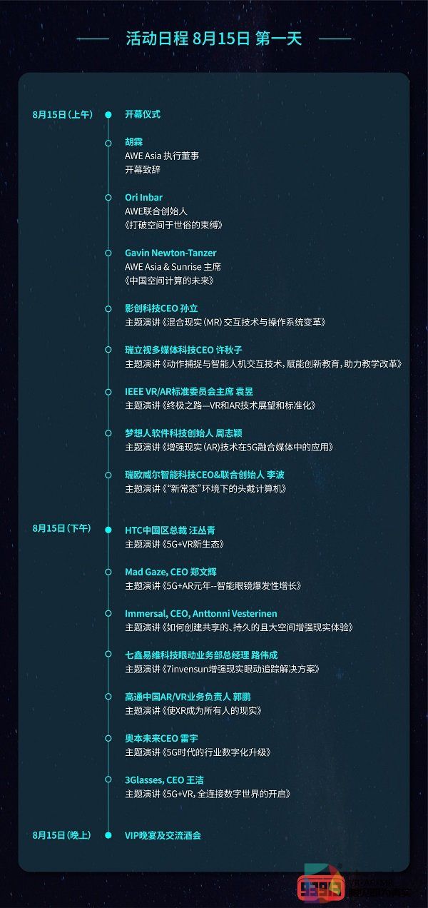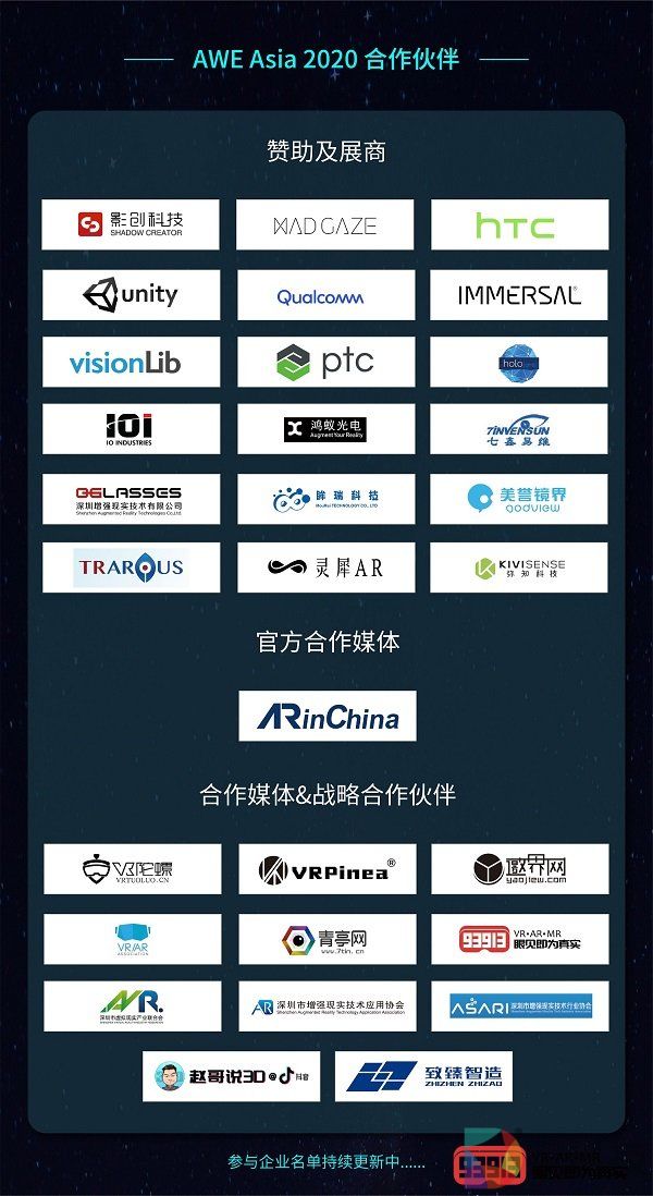 在历届AWE大会上,不仅有Lenovo、Joinpad、Vufine、华为等诸多国内外顶尖企业赞助及参展,还有来自美国、德国、意大利、韩国、澳大利亚等国家的多位国际顶尖演讲嘉宾进行技术分享和产品演示。本届AWE Asia 2020赞助及展商如下:
