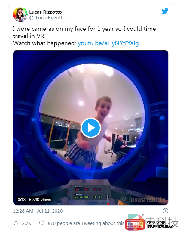 据nerdist.com报道,美国发明家Lucas Rizzotto发明了一台能“时光倒流”的VR“时光机”,在这个虚拟的时光机里他可以重温过去一年中的美好时光。