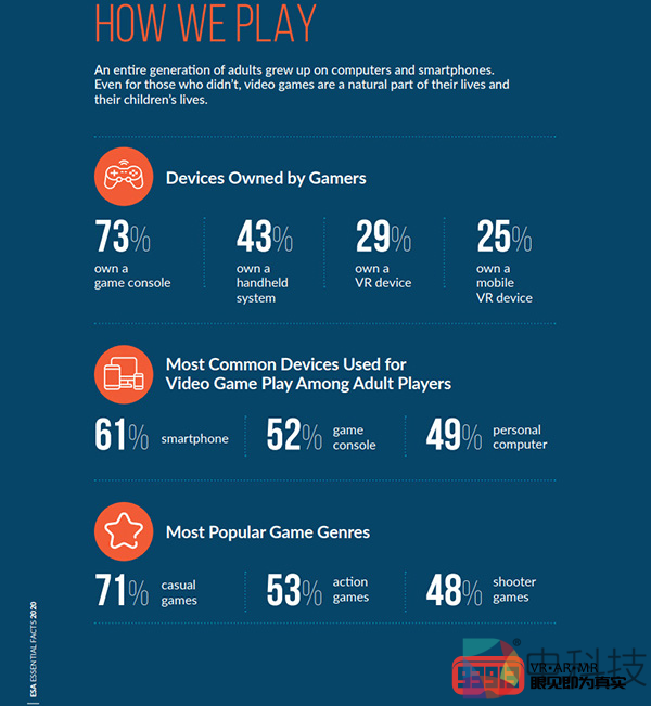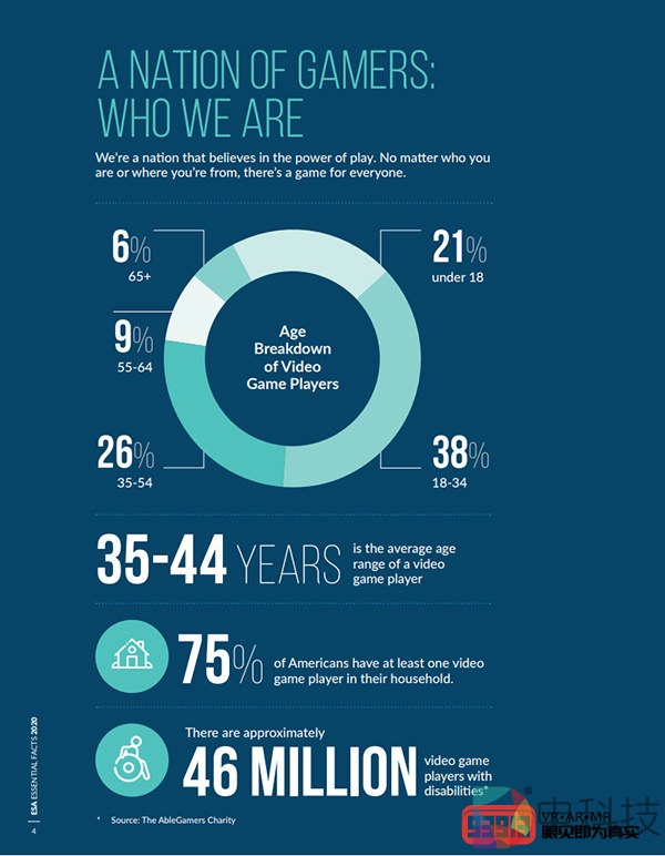 近日,E3举办方ESA发布了“2020年电子游戏行业基本事实”报告,数据来自于2020年Ipsos对4000名美国人的调查。报告指出,2020年全美超过2.14亿人每周至少玩一个小时的游戏,全美75%的家庭至少有一个人玩电子游戏,拥有VR设备的玩家占比达到了29%。