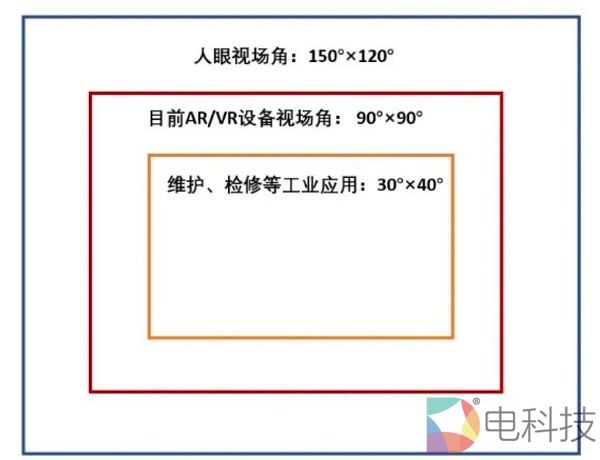 消除纱窗效应的方式是使人眼覆盖的视场角具有高分辨率,但当前设备的视场角和角分辨率还有待提升。视场角(FOV)即视野范围。人眼的视场角范围大约为150°×120°。对于工业级产品而言,视场角在30°×40°即可应用于维护和检修等作业场景。但对于消费级产品来说,视场角越大越能满足用户的沉浸体验。