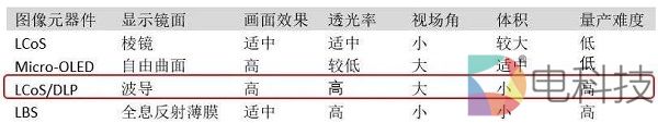 光波导为性能最优的光学显示镜面,但也是量产难度最高的技术。它可以解决视场角和体积间的平衡问题,使大视角图片在小体积光学镜片中无损复原,在不影响画质的基础上做到轻薄。由于波导只负责传输图像,是独立于系统之外的元件,这种特性也使得显示屏和成像系统可以移至额头顶部或侧面,不遮挡用户视线,设计美观。