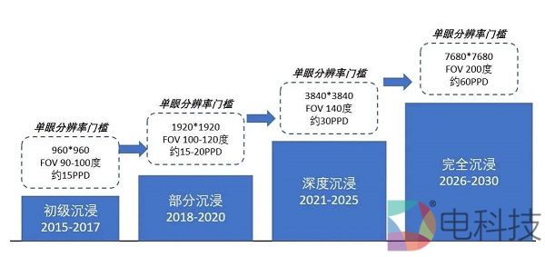 然而,目前国内外代表产品在一定体积与重量的约束条件下,视场角大多仅停留在 90°×90°的水平,和人眼的视野范围还有很大差距。就分辨率而言,当角分辨率达到60 ppd,即视场角中的1度能看到60个像素时,用户就不会产生像素感。但是角分辨在2020年也只能发展到30 ppd, 离60 ppd差距还很大。