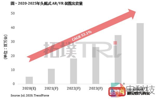 根据TrendForce集邦咨询旗下拓墣产业研究院的预测,2020年全球AR/VR设备出货量将达512万台,而受益于华为、苹果、三星、Facebook等巨头推出更多眼镜式AR/VR设备,202