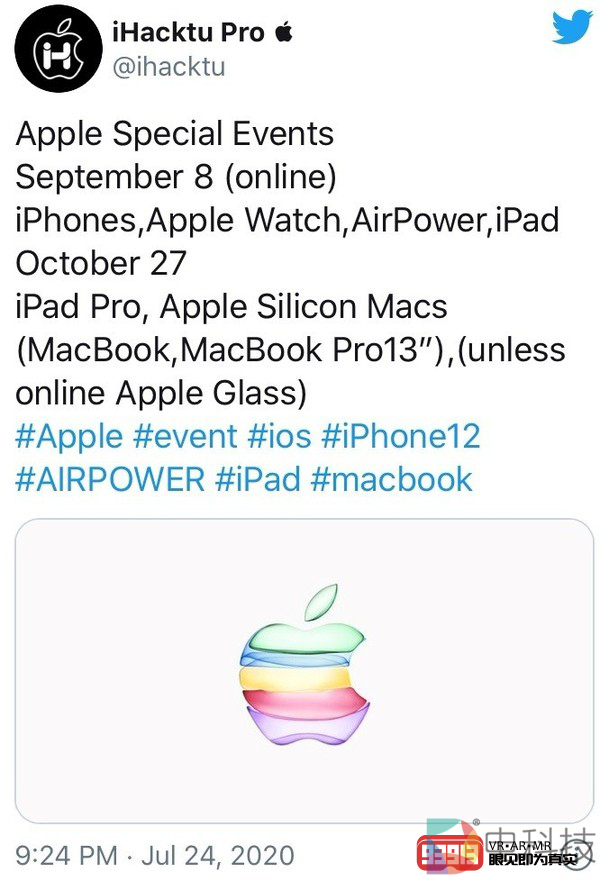 日前,国外科技爆料大神 iHacktu Pro和Komiya不约而同的在Twitter上透露,苹果将于9月8日举办线上发布会,发布iPhone 12系列、新Apple Watch、iPad 以及某个版本的 AirPower;而在10月27日,苹果可能会举办另一场活动发布iPad Pro、搭载Apple Silicon的MacBook(包含MacBook和13英寸MacBook Pro),甚还可能有Apple Glass!