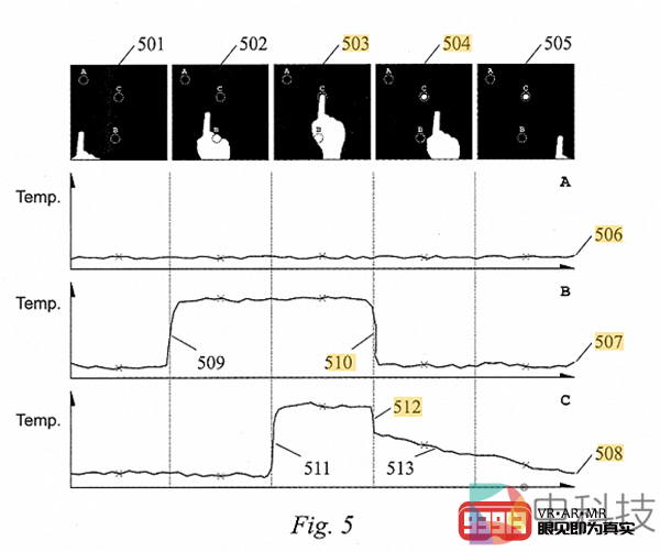 苹果的想法是,可以通过红外热感应来检测用户何时触摸现实世界的物体,这个方法可以让AR眼镜在视觉上将控件投射到现实世界的物体上,并在用户触摸这些物体时,通过感知触摸物体时的热传导来做出反应。