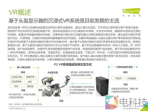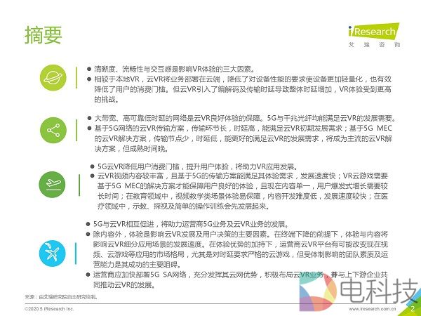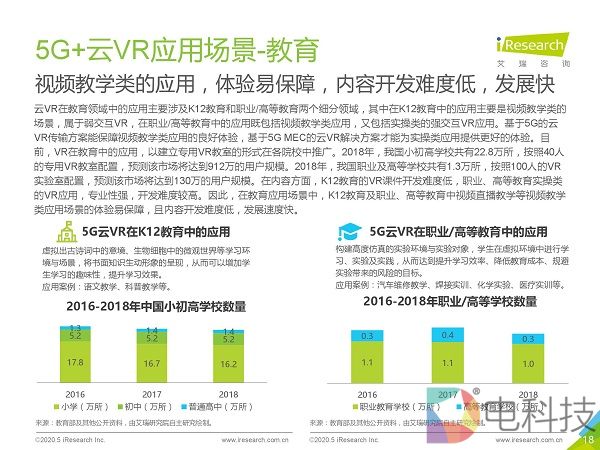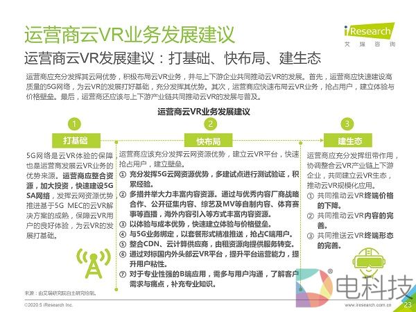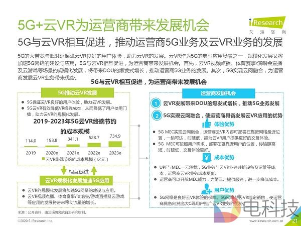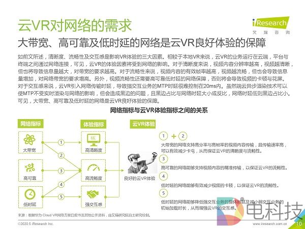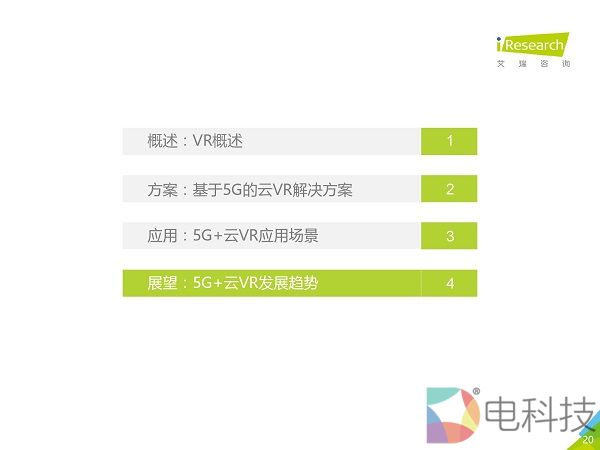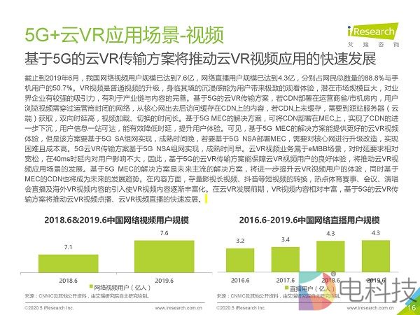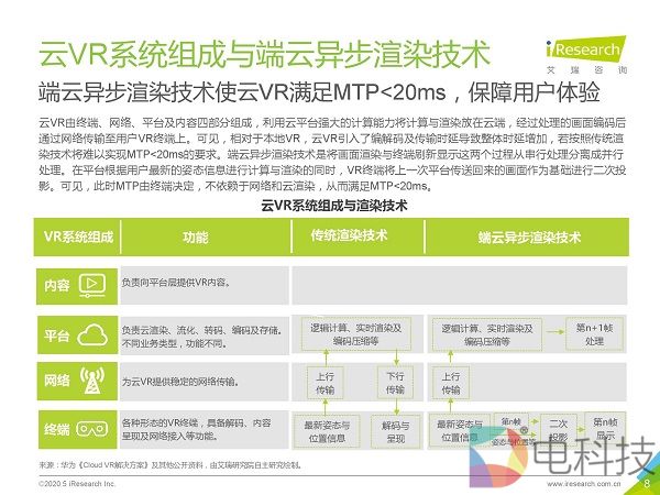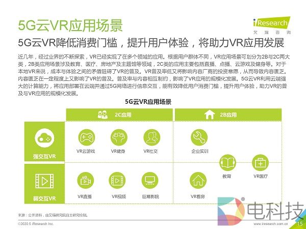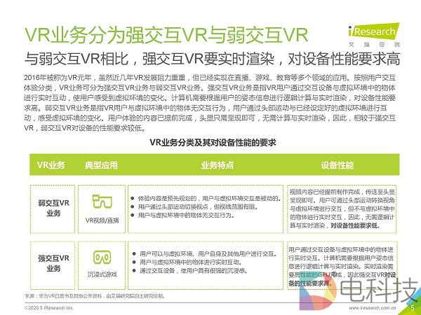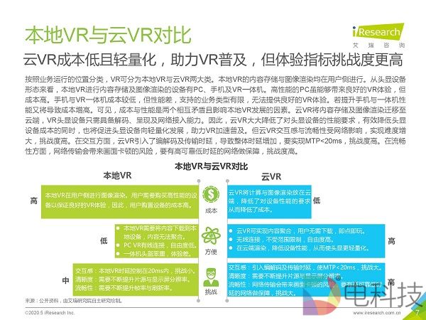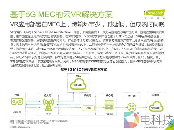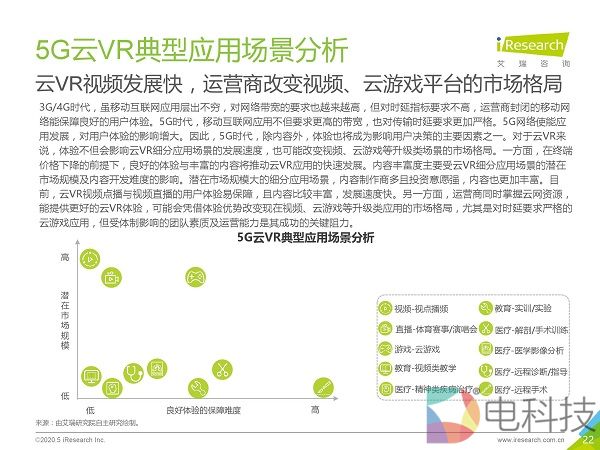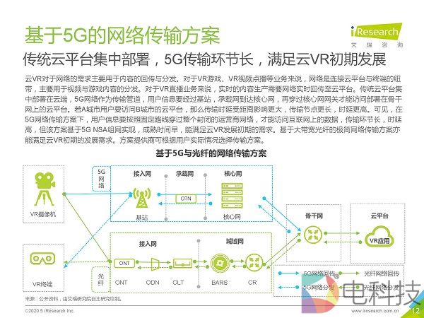 市场调研机构艾瑞咨询发布《2020年5G+云VR研究报告》,该报告首先通过对本地VR与云VR进行对比,总结出云VR的优势与挑战,然后重点对云VR的解决方案与典型应用场景进行