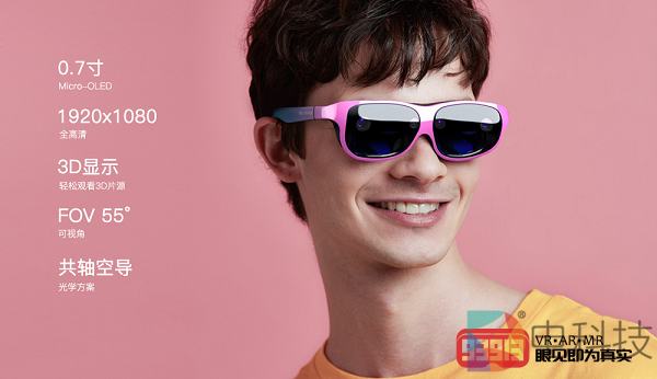 采用双目太阳镜式设计及共轴空导光学设计,整机重量只有70g,FOV为45°,双目的0.39吋Micro-OLED屏达到1920*1080高清分辨率,可以兼容Windows和Android系统设备。主打游戏娱乐、文化旅游与教育培训三大应用场景。提供四款糖果色配色:星空黑、星光白、星云红及星球蓝,并可根据个人需求调整鼻托,同时配有可拆卸视力矫正镜片。