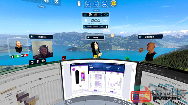 作为一款主打开放式虚拟办公的应用,「vSpatial」可以与包括微软Office套件在内的桌面生产力工具整合,让用户可以直接在VR环境中使用PPT、Word、Excel等办公软件。在「vSpatial」提供的全景式VR工作空间中,可以同时放置多个窗口,非常适合虚拟办公和远程协作。