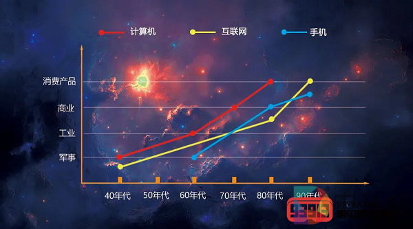 我们回顾一下技术应用的发展规律,你去看计算机,互联网或手机的发展历史,就能发现这些技术的发展有几个阶段,第一个基本都是从军事开始往工业往商业扩展,最后才跨到消费端,XR技术的应用也是一样遵循了这个规律。这几年行业内常说XR是所谓的Extended Reality扩展现实,包含了VR虚拟现实,AR增强现实和MR混合现实。其实虚拟现实技术已经存在超过60年了,但是在12年谷歌推出Google Glass,把微小化做到一定程度之后,整个市场才看到一个新的可能,新的机遇,包括14年Facebook以20亿美金收购了Oculus,VR设备开始爆发,发展速度非常快,但遵循的应用模式我觉得还是一样的。