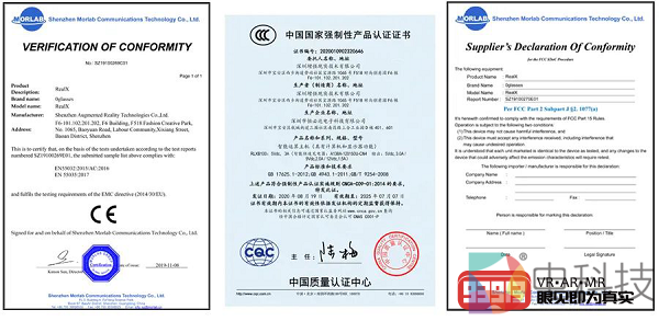 自主研发的产品也通过了中国3C认证、欧盟CE认证、美国FCC认证、ISO9001质量管理体系认证、无线电发射设备型号核准认证和防爆认证(0glasses是国内首家为AR眼镜申请防爆认证的企业)等,保证了产品的安全性及可靠性。0glasses拥有丰富的硬件设计/生产经验和良好的供应链资源;拥有自研的XR基础算法、软件产品,确保软硬同步发展,可满足客户的不同需求,提供更好的用户体验。