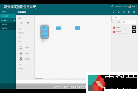 PSS全终端工作辅助系统主要分为操作客户端和网页管理端两个部分。操作客户端采用墨镜式AR眼镜以及小型PC,一线巡检人员通过眼镜进行可视化AR交互与引导作业,并实时采集数据进行数据分析,协助进行设备状态智能化判断;在遇到难以解决的问题时,可与技术专家进行远程视频通话,获得操作指导。网页管理端采用WEB部署的模式,可在任意设备上打开网页管理界面进行操作,包含人员管理,任务编辑,素材管理,权限设定等功能,核心为巡检任务的流程编辑,可根据实际的巡检需求,灵活编辑定制巡检任务流程,导入图文声像及3D模型动画等AR素材,并发布到客户端进行操作。
