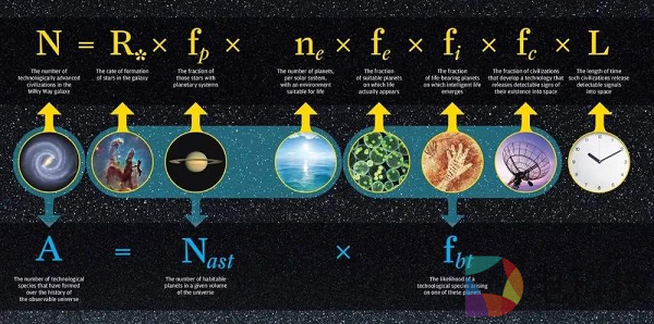 银河系内可能与我们通讯的文明数量=银河系内恒星数目×恒星有行星的比例×每个行星系中类地行星数目×有生命进化可居住行星比例×演化出高智生物的概率×高智生命能够进行通讯的概率×科技文明持续时间在行星生命周期中占的比例。