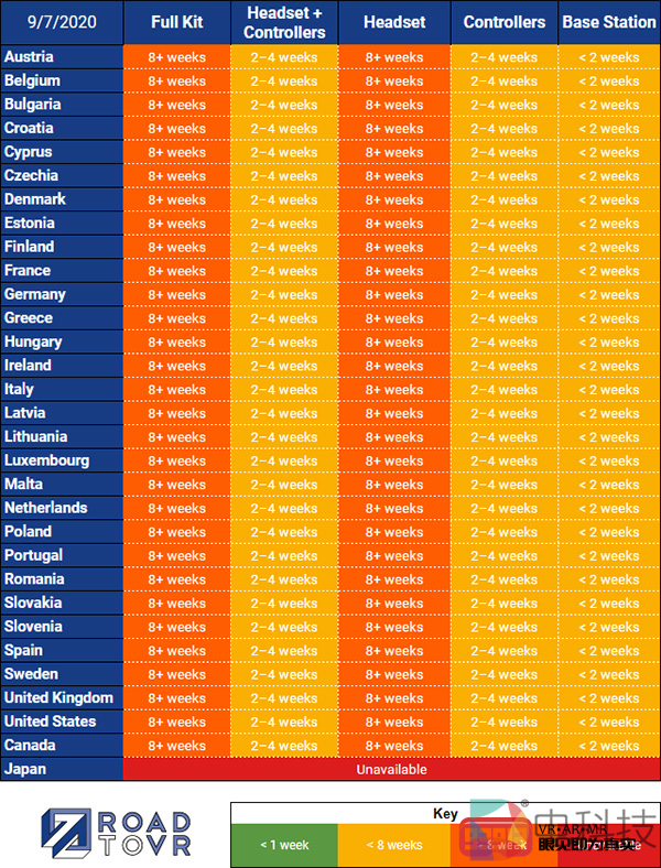 RoadtoVR的最新统计数据显示,在绝大部分发售国家和地区,Valve Index VR套件(Full Kit)和单独头显(Headset)需要等待8周+才能发货。不过,「头显+控制器」组合的发货周期已经缩减到2-4周,2.0定位基站(Base Station)也从此前的全面缺货状态缩减到2周内即可发货。