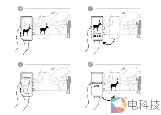 观众们拿着智能手机探索场馆时,会在手机屏幕上看到各式各样的动物,将手机镜头对准动物即可进行收集,被收集的动物将会从场馆中消失,加入观众手中中的动物集合里。观众在手机上了解了动物相关的知识后,只需将手机中的动物拖到屏幕中的墙壁上,即可将动物再次释放到场馆中。