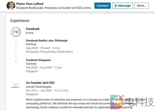 Lemnis联合创始人兼CEO Pierre-Yves Laffont曾在8月中旬发布了一篇博客,指出该公司将“踏上新的冒险之旅”。尽管Laffont没有透露具体细节,但我们发现他最近更新了在LinkenIn的个人资料,表明他自2020年2月就已经供职于Facebook Reality Labs。