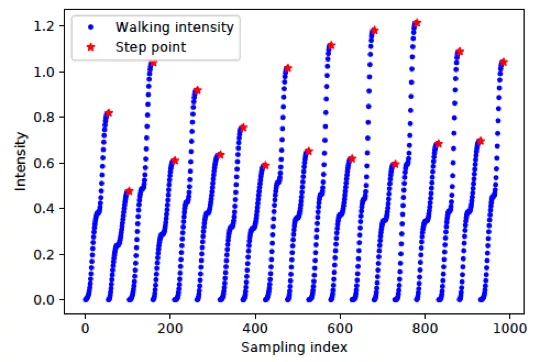 下图展示了真实行走状态下步态强度的变化情况,其中蓝色点表示步态强度,红色点表示步点。