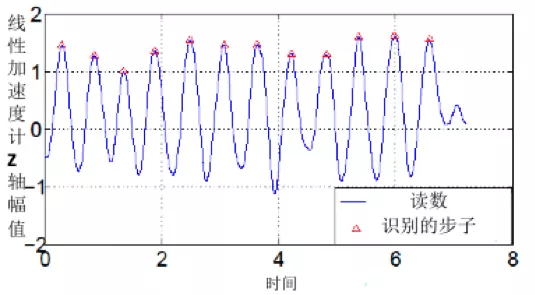 计步算法示意图如下图所示,其中蓝色曲线表示加速度计读数,红色三角形表示识别到一步。