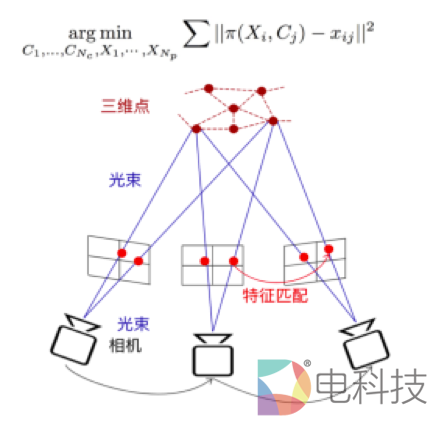 首先我们了解下SfM的技术框架,一共四个主要步骤:①数据采集;②特征提取;③数据关联;④结构恢复。在恢复场景的三维结构时,并不是使用图像中的所有像素点,而仅从图像中提取稳定、显著的点,也就是特征点;数据关联是确定有共视区域的两张图像中哪些特征点是对应的;后续会借助几何的方法以及最优化技术(Bundle Adjustment)将这些图像中的点恢复为空间的三维点。整个问题最终被转化为大型非线性最优化问题求解,优化目标是重建的三维点重投影到图像中的位置与图像中的观测点位置差最小,也就是最小化重投影误差。