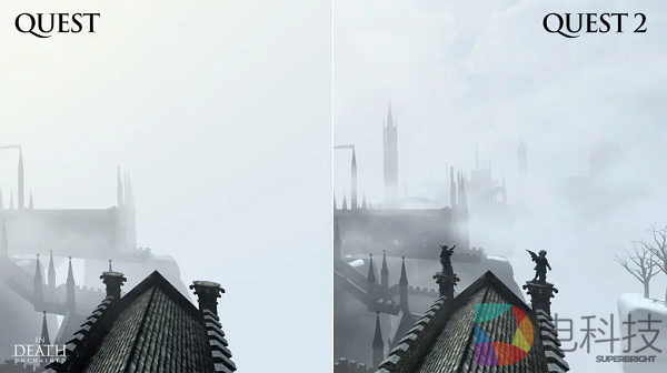 根据Superbright的官方新闻稿,Superbright使用“经过大量修改的”虚幻引擎开发了《In Death:Unchained》,而Quest 2版本很快将具有Quest 1硬件无法实现的特殊“升级和优化”。具体来说,新闻稿中提到了“立即显示整个游戏世界”的能力即远景渲染距离的改进,并在此基础上添加了更多“额外的视觉元素”。此外新闻稿中还提到了这次增强更新将带来“更清晰的视觉效果,更高的舒适度和更流畅的游戏体验”。