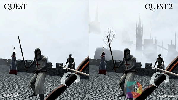 上面两图中很好的展示了《In Death:Unchained》Quest 2增强更新的改进,我们能够明显的看到游戏远景的渲染距离得到了极大的改善。由于游戏中拥有弓箭或十字弩之类的远程武器,因此能够在更远的距离更清晰地看到敌人至关重要,可以显著提高本来就不错的游戏可玩性。