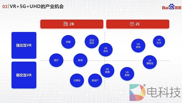 在VR行业发展过程中,可以从TOB、TOC与强交互、弱交互两个维度将产业机会切分成四个象限:现有比较成熟的应用场景为教育、地产、实训、VR影院、VR游戏等方面,此外,党建、医疗、展会、直播、社交已日益成为VR未来发展的新机会与新方向。目前,在「VR+5G+UHD」的技术加持下,使得VR能够应用到更加广阔的场景中去,整个VR产业也迎来了全新的发展机遇。