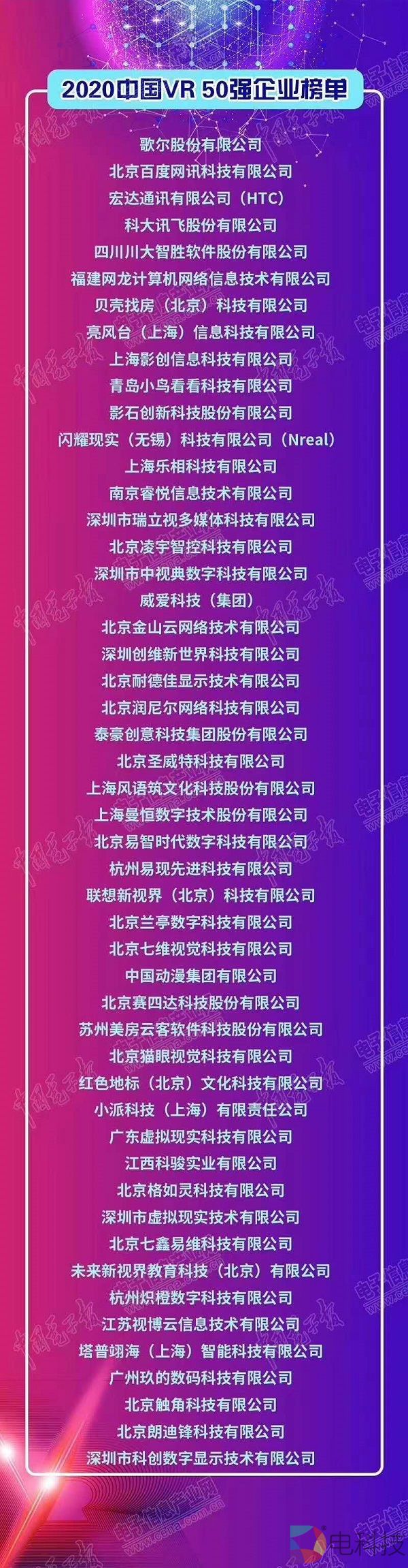 在10月19日上午举办的2020世界VR产业大会主旨演讲环节最后,中国工程院院士、虚拟现实技术与系统国家重点实验室主任赵沁平代表组委会公布了本次“中国VR 50强”企业名单,入选企业如下: