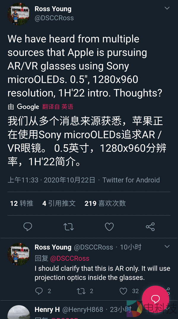 全球显示领域权威咨询机构DSCC(Display Supply Chain Consultants)的CEO Ross Young则在Twitter上进一步证实:苹果正为AR/VR产品寻求与索尼的合作,并表示将把索尼的Micro-OLED(0.5英寸,1280×960分辨率,PPI>3000)应用于AR眼镜产品。