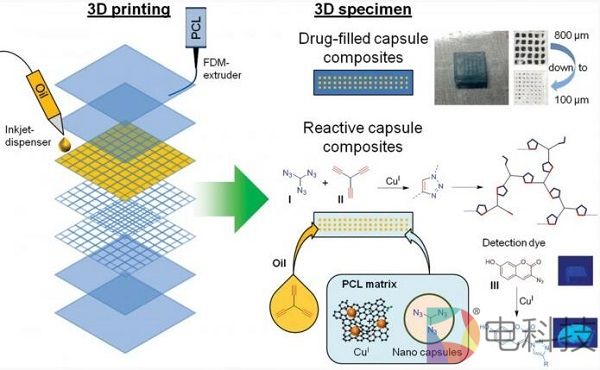 据了解,该技术利用了一个独特的系统,包含了两个3D打印头——一个通过连续挤压多层熔融聚合物来构建物体,另一个(喷墨打印头)则用来储存微小的液滴。